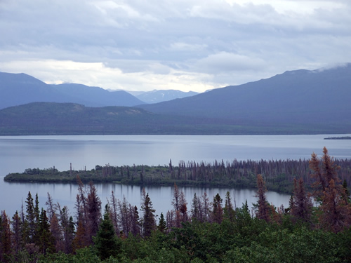 We stopped and took this photo at one of the frequent pull-offs along the highway. The view is looking east over Dezadeash Lake to the shoulder of Shi Dhal mountain on the distant left. The lake was once used as part of their trading route by Tlingit and Tuchone Indians.