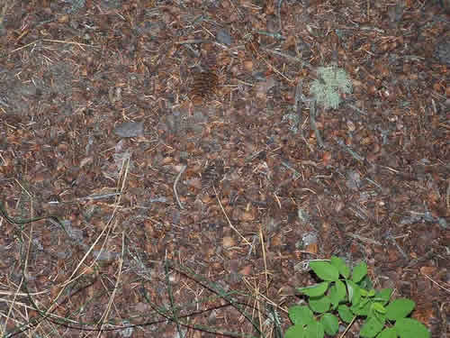 The area is home to red squirrels, which take apart spruce cones and eat the little seed in the axis of each cone leaf. Here's a squirrel midden, littered with discarded cone leaves - only one untouched cone. Each squirrel has its own ("mother") spruce tree.