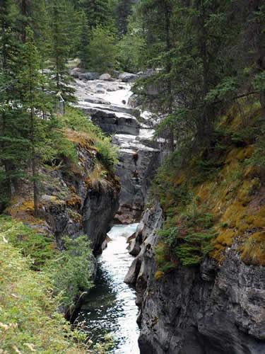 Here is the Maligne (Fr. "wicked") river, just above the beginning of the canyon. The river was named in 1846 by a Belgian priest travelling in the area and who had an incredibly difficult time crossing the it.