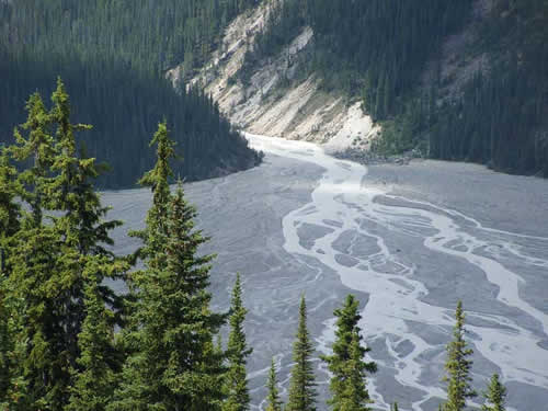Peyto Lake is fed from melt off the Peyto Glacier. Here you see the melt flowing through an alluvial fan created from glacial till (a mix of clay, sand, pebbles and boulders.) The melt dumps rock flour-the finest sediment-into Peyto Lake. The flour is responsible for the beautiful color.
