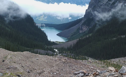 Here's a view looking back towards Lake Louise. You can see a corner of the Fairmont Lake Louise Chalet, another huge Canadian Railroad hotel built in 1898 to attract tourists to the area. That it has certainly done.