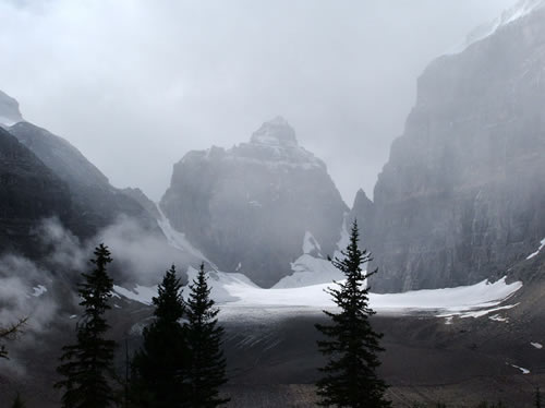 At the top of the trail, we were rewarded with this view of the Victoria Glacier through the mist. We could count 4 other glaciers visible to us through the clouds.