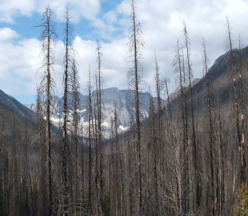 A huge area of BC burned in 2003, including much of the forests in Kootenay. See the burned hillsides behind the trees in the forefront of this picture. Regeneration was beginning with fireweed and other low ground plants. We saw 2 mule-ear deer indicating some wildlife is back.