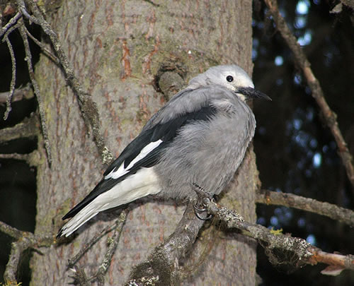 This cheeky bird is a relative of crows, jays, and ravens - the corvid family. They fly miles to find seeds of pine trees, but (like the other corvids) will eat practically anything, including garbage and eggs of other birds.