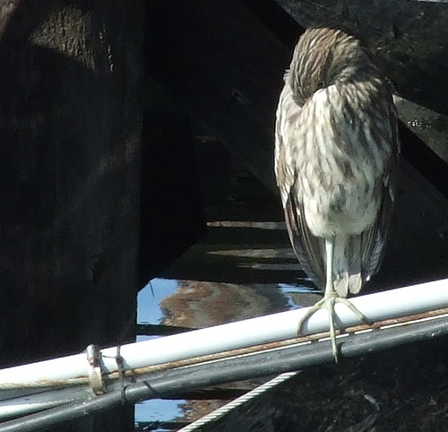 This is a young black-crowned night heron. The plumage is quite different from the adults. Like most birds, it's napping with its bill tucked in (do they feel cold on their bills?) and one eye on alert. And, like many birds, it does this on one leg with the other one snugged up to keep warm. How about that for balance!