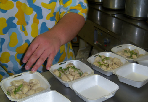 One place you must eat in Juneau is the Pel'meni "restaurant." It opens usually 11:30 daily, and stays open to 3:30 a.m. on weekends. It's in the blue building opposite the traffic light at Main Street and Egan Drive, a block from the cruise ship dock. All this place sells are Pel'meni, which are delicious little Russian dumplings. On our list of favorite eats.
