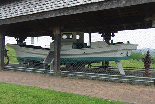 In September, 1985, Kazukio Sakamoto left Owase, Japan, for a day of fishing aboard his boat, the Kazu Maru, and never returned. 18 months later the Kazu Maru was found empty and adrift off Queen Charlotte Islands and was brought to Prince Rupert where it was discovered to have come from Prince Rupert's sister city, Owase, Japan. The people of Prince Rupert have restored the boat and put it on display (seen in this photo) as a tribute to all those who have been lost at sea in the Pacific.