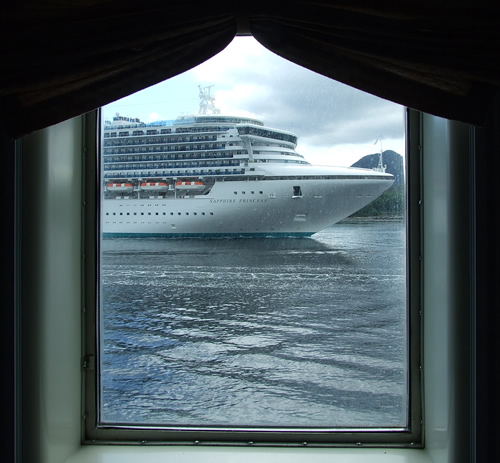 Our cabin had a window, which was great so we could see what was happening, and to some extent keep track of where we were. Can't say we were enthralled with this particular view, but it gave us a sense of dimension. The Matanuska is a big boat, but she was completely dwarfed by these monsters.