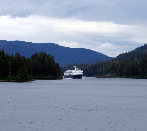 At the end of Peril Strait the Matanuska stopped and did a 360° circle in narrow waters, leading us to wonder.....? Then we realized she was waiting for the ferry Columbia (shown here) to exit from the north end of the Sergius and Kakul Narrows. The ferry route takes a 30-mile shortcut to Sitka through a very narrow, zigzag channel only 300' wide. The tide rushes through at up to 10 mph. Passage through these narrows is timed on “slack” to avoid the worst of the current. More navigation challenges for ferry crew.