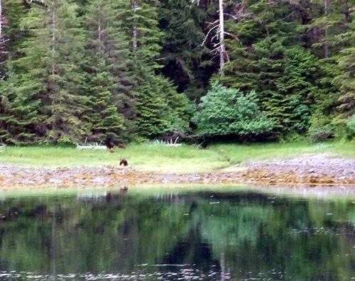 Soon after we left Sitka, we (barely) caught a glimpse of some brown (i.e. grizzly) bears. We think these were a sow with 3 (or 4?) cubs, hanging out at the water's edge in Starrigvan Bay. Our fumbling photographer almost missed them, the only bears we saw on our trip up the Inside Passage.