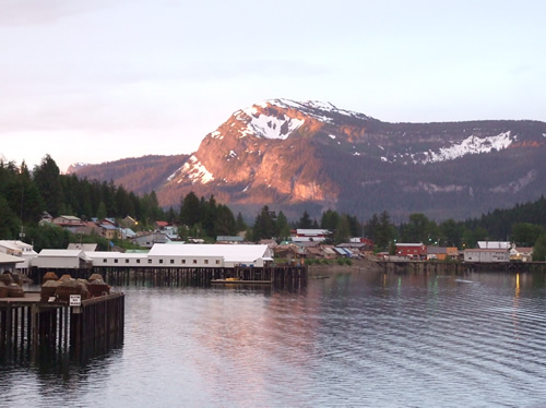 This photo shows Hoonah as the ferry and the sun arrived together just before 4:00 a.m. [We set our alarm to wake us at 3:00 a.m. If you do this trip, take an alarm clock or you'll miss the best parts.]