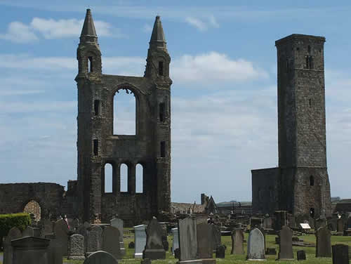The remains of St. Andrews Cathedral with St. Rule's tower on the right. St. Andrews was the focal point of the Scottish Church throughout the Middle Ages, with the Cathedral begun in 1160 and the University soon after. The town is steeped in history.