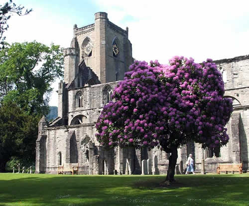 Dunkeld Cathedral, set off by a magnificent mature rhododendron bush.
