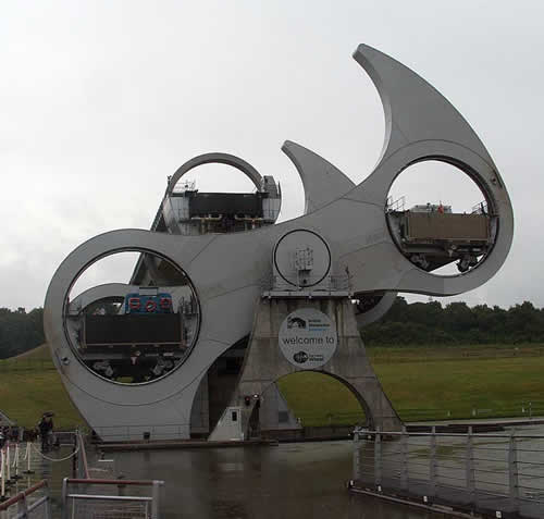 Glasgow's Forth and Clyde Canal was once connected to Edinburgh's Union canal by a series of 11 locks. Recently, a magnificently engineered wheel has replaced the locks. This Falkirk Wheel is the world's only rotating boat lift. We watched it operate in the pouring rain.