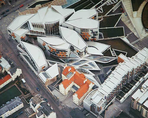 We visited the new Scottish Parliament building, near Holyrood Palace. One cannot do justice to this fantastic (and fantastically expensive) building with views from the ground. So here's a photo of a postcard showing the Parliament complex and all its convolutions from the air.