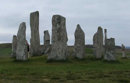 The Isle of Lewis has several sites with standing stones. These are at Calanais, believed to be 5,000 years old. The stones are cut out of Lewisian Gneiss, the oldest rocks in the world (3 billion years).