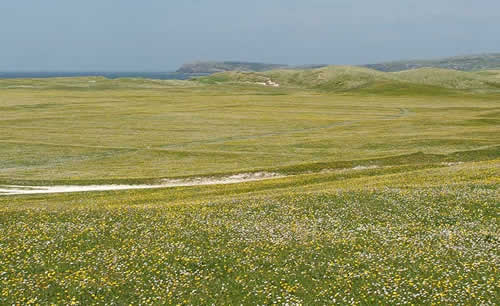 Machair (macker) on the Atlantic side of Barra, brilliant with buttercups & daisies. Machair, unique to western Scotland and Ireland, a mosaic of wet and dry grassland with a great variety of flowering plants, forms as wind blows shell sand inland for thousands of years.