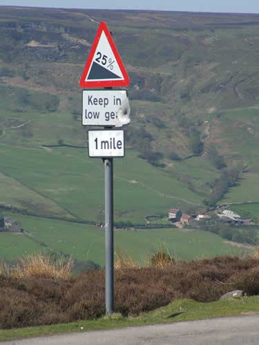 The roads up and down the moors are STEEP! This is the warning sign for a one-in-four grade, not uncommon here.