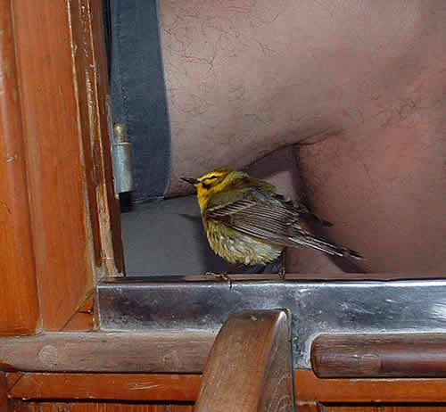 Day 2 Collected email and weather (grib file), and sent position report at 0430 hours. Continued sailing north, freighter passed astern at 1000 hours. At noon, winds very light from SSE, rolled in the jib and turned the motor on for an hour to run the 'frig. Took reef out of the main and adjusted the second reef line. At 1800 hours a very small (3") yellow and brown bird came aboard for refuge, warbler or lark type. It hopped around before finally settling in a nook on the aft end of the cockpit. Put out some water and breadcrumbs. Put reef back in main at 1900 hours, turned engine on and motored through near calms. Bird looks exhausted, slept quietly through the night. Light E to ESE winds, 0-10 knots. 102 nmiles by the log, average boat speed 4.3 knots.