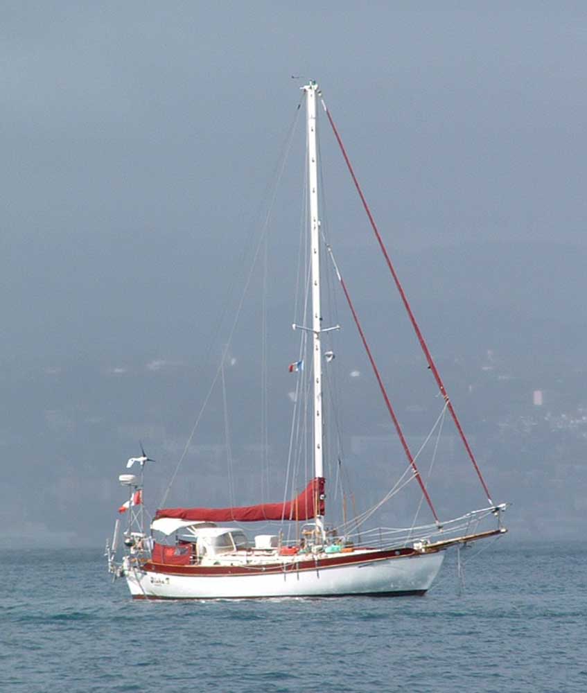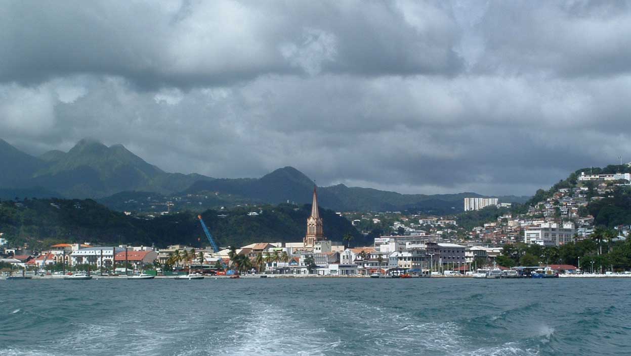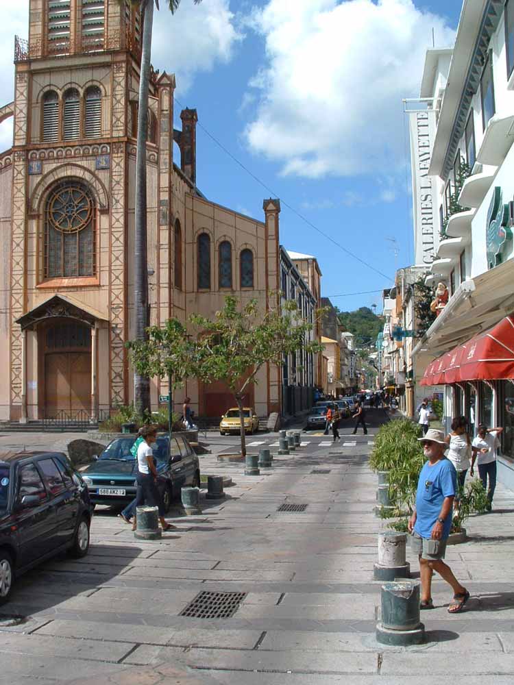 Saturday morning we dinghied ashore, stopping by on the way to say hello to Canadians Gwyn and Sandy, on the Westsail 32' cutter Aloha T, last seen in St. Anne. We wandered round the lovely little villages of Pointe du Boute and Anse Mitan, both pleasantly touristy resort areas. Pointe du Boute felt straight out of France. Took the ferry (6 euros return, 15 minutes each way) to Fort De France and wandered around the older parts of downtown and adjacent areas. A very neat city. Back to Callipygia for a nap, then a swim from our wonderful new swimladder, installed in Trinidad. What a difference it makes. Happy that we're doing a better job at incorporating photos into the website, and more often remembering to take photographs. Sunday morning learned on the radio that Gallivant arrived in Tobago yesterday, it's EPIRB had malfunctioned, all is well. Did a few boat chores and spent time reading cruising resources for Ireland--resources are quite different to what we have become accustomed to. Foxfire II showed up in the anchorage, visited with them for a little in their large roomy center cockpit. Ate excellent lunch at Chez Fanny's, across from the beach in Anse Mitan. Monday, took laundry ashore (27 euros for 3 loads wash, dry, and fold, ouch) and ferried over to Fort de France to clear out with customs. One of us has developed a couple of painful joints on right hand, strapped it up. It is bit disabling. This morning, upped anchor at 0925 hours and headed out into the bay. Sail slide came off while hoisting the main, and also lost the first reefing line inside the boom--don't know what happened to the stopper knot on the end of it, it has evidently come undone. Since only a short distance to St. Pierre, brought main back down and motor sailed with jib up. Dropped anchor at 1130 hours. 16 nmiles by the log, average boat speed 5.5 knots. Found Aloha T here already, and were later joined by Kish. Visited a little with both of them as they stopped by on way ashore. Strange anchorage, along the edge of this former capital of Martinique--oblitered by eruption of Mt. Pelee in 1902, only 1 survivor out of 30,000 inhabitants. Pretty little fishing town, a working place not a tourist place. Shelf off the beach is quite narrow and drops off quickly, so boats all anchored in a line fronting the beach, swinging every which way as flukey winds play down from the mountain. Sorted out sailslide problem, investigated boom--no easy way to get a messenger along and rethread the reef line. Changed the second reef line to go to the first reef cringle in the interim.