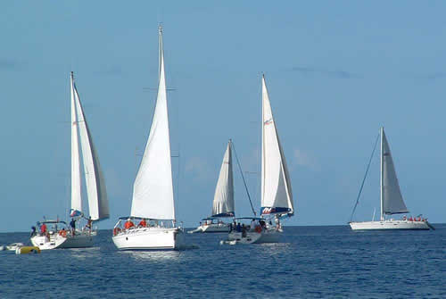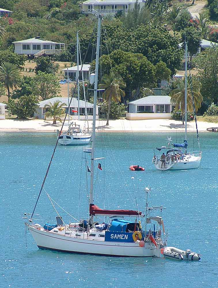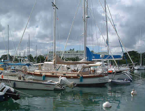 Count down time. Busy week. Dissassembled, cleaned, serviced and greased all 9 winches. Oh dear, one spring for the port staysail winch is bent. None of our spares fit. Checked around, none available anywhere. Sent email for parts to the Australian Yacht Winch Company which is the only place still with any parts for Barient and Barlow winches. In the meantime, fiddled with bent spring, and was able to get it back in to the pawl, winch working fine. Not in our budget to make any winch replacements. Made laminated chart of Atlantic showing changes in magnetic variation--quite substantial as we cross--on one side, and major shipping lanes on the other. Put various details and our course to Bermuda on the plotting sheets for first leg. Printed out from the Internet an excellent 24-page article entitled "Yachts (Private) Sailing to Bermuda" from the Bermuda Department of Tourism. Notified friends and family of general itinerary from here to Cork and who we'll be filing Float Plans with. Got sails back from St. Martin Sails and Canvas. Refolded and stowed yankee, put genoa on the Profurl, the forestay roller furling system. Read the instructions, and adjusted the position of the halyard at the top of the extrusion accordingly. Checked all the Profurl fasteners, and bought spare parts for the Profurl at Budget Marine--they are well stocked. Had small folding table for the cockpit, with fiddles, made by Maintec. Tried it out at Happy Hour--what a great amenity to have somewhere to put a plate of munchies that all can reach. Bought new 35lb Delta anchor to replace our trusty but rusty primary anchor (per the insurance survey recommendations). Decided to do it now because of great discount at Budget Marine. If we can find space, we'll clean up and keep the old one. Can never have too many anchors. Rented car on Monday and circumnavigated St. Martin. Drove past airport and clockwise round the lagoon to Marigot. Got majorly lost on Dutch side (washed out roads, no signs) but -- hay presto -- crossed to French side and immediately things improved. Took detour on the east side to Oyster Pond and look at the lovely Atlantic beaches, then to Philipsburg (4 cruiseships crammed into the dock, and one anchored). This dry and scrubby little island is very developed everywhere, with remnants of hurricane damage obvious in some places, and a lot of litter. Must make those who lived here 20-30 years ago want to cry. Filled up our little rental car to the brim with provisions, etc, and came back home to trolley them down the dock and hand them onto the deck. Then down the V-berth hatch and dump them on the bed which they completely overwhelmed. Slept in the salon that night. Tuesday and Wednesday, sorted out the stores, removed all packaging, ziplock-bagged the dry stuff, and dated each item. Then organized them into categories, added them to the food inventory, and somehow got half of everything stowed away in lockers. Found the source of our little bugs--in the game hammock. We had some juggling balls which were filled with some kind of grain. They were completely infested. Threw 'em out, cleaned everything up, hopefully routed the critters. Be nice to be bug free for a while.