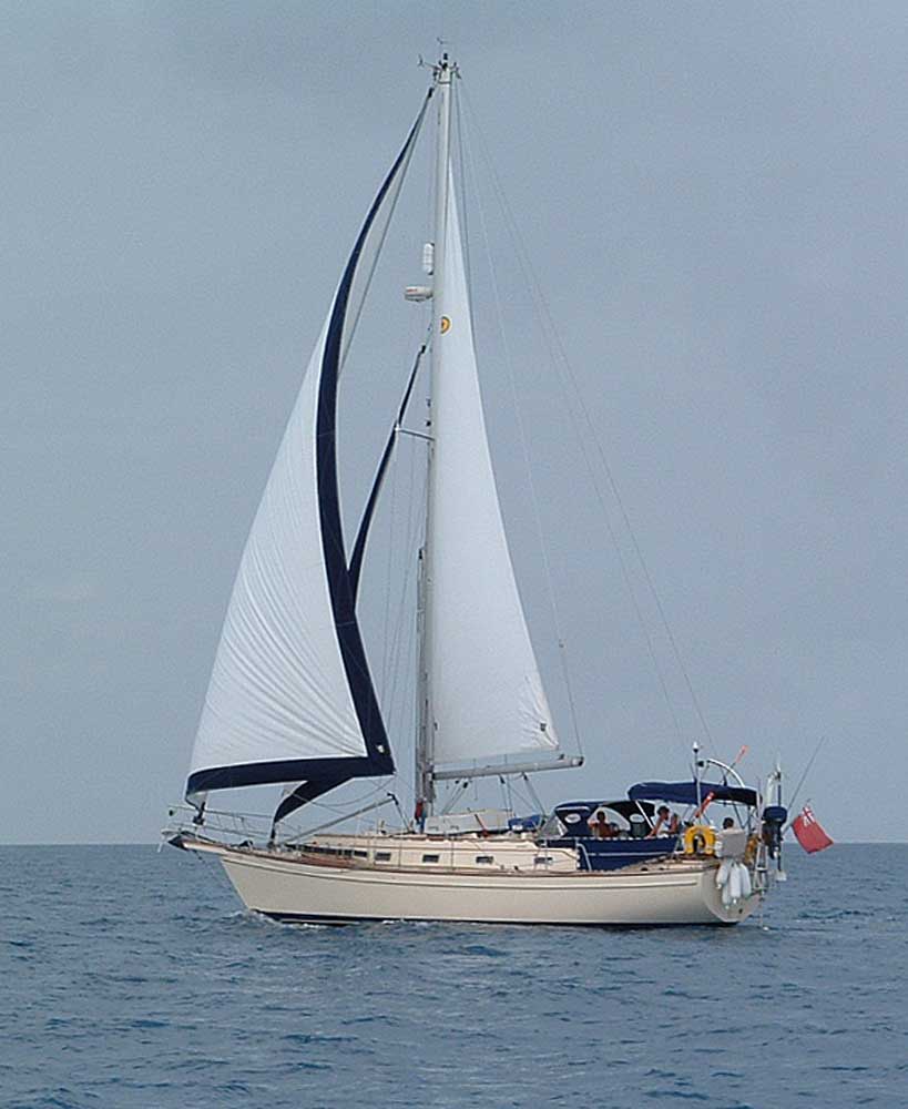 Day 1 Made lifetime supply of sandwiches and prepared the boat. Left the dock at 1100 hours to motor through the lagoon and await the bridge opening. Once into Simpson Bay, stowed the anchor, secured everything, and raised the main with one reef in it. Second reef line needs adjusted or 'twill foul the main when we shake the first one out. Raised the staysail, and unfurled the genoa. Pumped the bilge dry--pink liquid from a little spilt diesel and plenty coolant from yesterday's fiasco. Headed north towards Dog Island passage, just east of Anguilla, nice broad reach sailing wing on wing with genoa poled out. Launched the tow generator. Through Dog Island passage at 1530 hours, a few fish pots. At 1815, Pat tying something down below lost balance and landed on the back of her head against the wooden strip behind the cabin cushions. Copious bleeding. Got out first aid reference and read through head injury. No concussion or other ill effects. Staunched the bleeding, and lay down. Gave herself a goood headache--the price of forgetting "one hand for the boat..." Sombrero light on port beam at 1900 hours. Tow generator working great, providing all the juice needed by Sinbad, the autopilot, the electronics, lights, fans, etc. Light E to ESE winds, 8-10 knots. 69 nmiles by the log, average boat speed 5.3 knots.