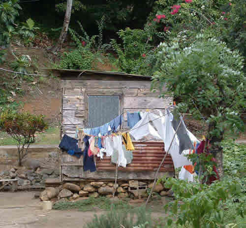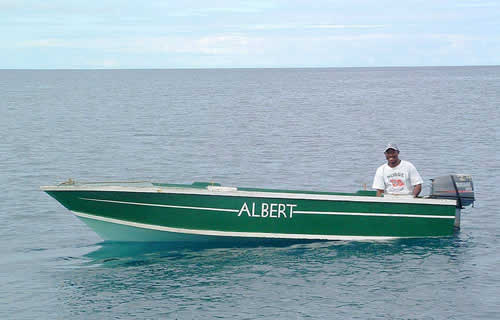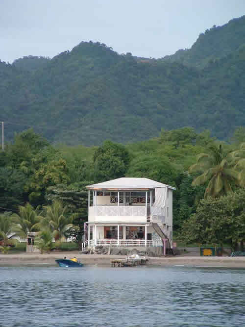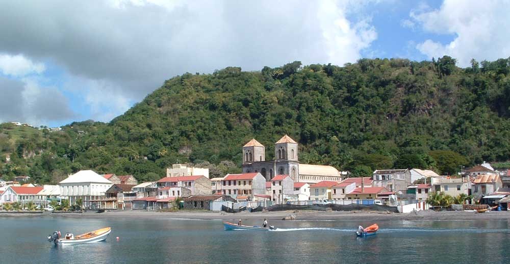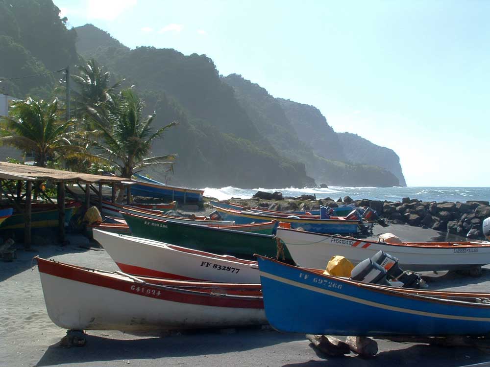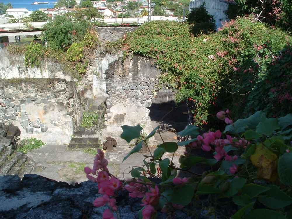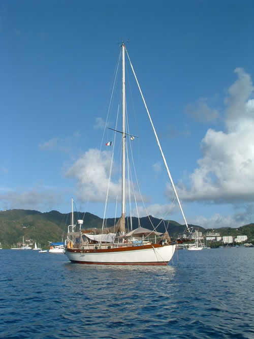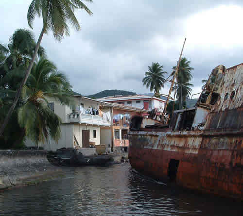 Wednesday, dinghied ashore to wander round St. Pierre. Went into the Musee Volcanologique to find artefacts recovered from Mt. Pelee's deadly 1902 eruption, and saw before and after photographs. Walked through the remains of the old theatre, and looked into the dungeon where the town's sole survivor (of 30,000 souls) was found. Then back and forth along the two main streets, parallel to the shore, of this interesting town--a shadow of its former self. Population now about 5,000. Some buildings have been restored, many have not. A poignant tour, ending with delicious lunch at Antoine's Beach, on the gray volcanic sand beach at the south end of the town. Happy Hour with Bob and Megan on Woof their US flagged Beneteau anchored next to us--invitation issued by Bob swimming over to deliver it. Deflated, hoisted and stowed the dinghy and motor and otherwise prepared for an early departure on Thursday. Mother of all storms is leaving the US heading northeast, with hurricane force winds building behind it. Center expected to drop below 950mb. Pray for shipping in the area. It will send northerly swells our way Sunday and Monday. Thursday, upped anchor at 0620 hours, and headed out into the bay. Raised main, then staysail and motored north. Hauled out yankee and turned off engine at 0800 hours as we entered the inter-island passage between Martinique and Dominica. Winds 12-15 knots, east-northeast, gentle 3-5' swells. Gorgeous beam reach, doing 6.5 to 7.5 knots under full sail until just abeam of Rousseau, Dominica, where we came into the lee of the island and lost the wind. Started engine and rolled in yankee, then dropped the staysail, and motorsailed in our own wind along the length of the island. Friendly exchange with Portsmouth boat-boy Albert who was waiting offshore looking for business at 1455 hours, a mile or so south of Prince Rupert Bay. Dropped anchor in the northern part of the Bay in 20' at 1555 hours. Love our little iPaq pocket navigation system--thanks Ralph! 60.8 nmiles by the log, 55.65 over the ground. Average boat speed 6.3 knots. Arranged with Albert for ride to customs for clearance in the morning. Planning to stay here a week or longer, and explore this beautiful lightly-populated volcanic island.