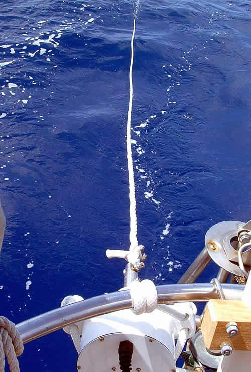 Day 5 Collected email and weather (grib file), and sent position report at 0430 hours. Seas down some more, around 4'. At 0600 hours, Reran the furling line, all working properly now, put out a bit more genoa. At 0800, VHF contact from Siamie, Serge, also heading north--made it feel a bit less lonely out here. Around 1100, winds and seas started picking up again, still NE. By noon, winds steady 20-25 knots, seas 6-8', going at hull speed. Rolled up the genoa completely. At 1415, hove to for a few hours break. Taking on more water as seas break over the bow. One jerry can came loose, go forward to retie and check the others. Rough going. Bilge pumps all working fine. Pat still nauseated, only Bill seems to have acquired some sea legs. NE winds, 18-25 knots. 128 nmiles by the log, average boat speed 5.3 knots. Westing still increasing