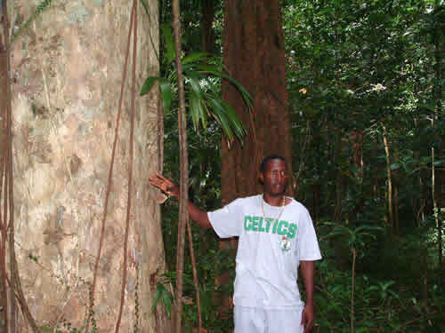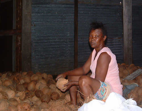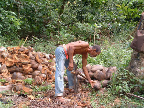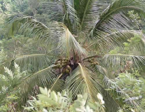 Tuesday, Albert took us ashore to meet guide Andy who drove us, in a small van belonging to his uncle Max, the taxi driver, across this rural island to the village of Calabishie on the east coast, past fields of coconut trees and toiling field workers to a coconut factory. [We did get permission from these people to photograph them, and provided an appropriate tip.] Dominica's primary agricultural products for export to Europe are coconuts, bananas, and citrus fruits. Some sugarcane is produced for the production of rum. Thereafter we drove up into the rainforest and hiked around, learning about the many different kinds of trees from Andy. Then we hiked to Milton Falls and took a most refreshing dip. We heard lots of parrots, and saw them flying in the distance. On the way back to the van, Andy fed us a snack of freshly picked oranges and pointed out a mahogany tree covered with seed pods. Dominica does a good job of protecting its natural environment, and we saw very little litter anywhere. We're enjoying being tourists in this beautiful island--definitely a not-to-be missed place, significantly enhanced by getting to know one or more of the boat boys, in our case Albert--whom we highly recommend. Remember though, it's important to agree on a price ahead of time for whatever, and then to stick by the agreement. One boat (Seraglio) anchored near us got in an ugly altercation with boat boy Ravioli Lover over money. Swells came down for a peaceful night's sleep. Wednesday, boat count down to 7 this morning. Albert drove us across the bay to customs, then immigration, to clear out--weather forecast pick up northeasterly winds and swells over the weekend or early next week, so decided to go to Guadeloupe before those set in. Wedensday, cleared out of customs amd immigration, and readied for departure.