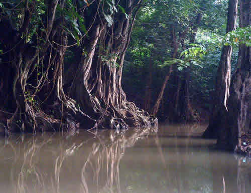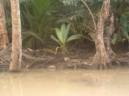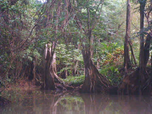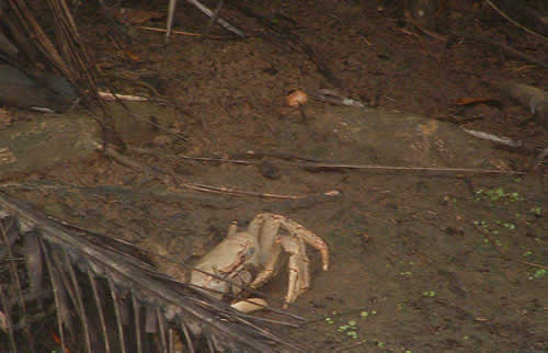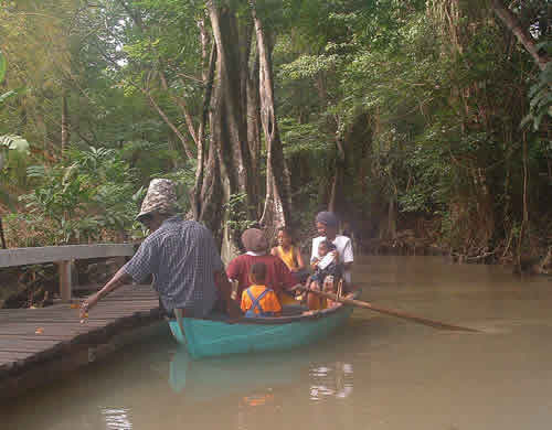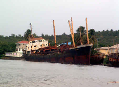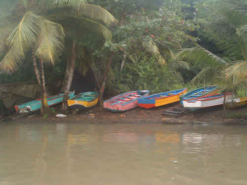 Friday morning, Albert came to take us to customs for clearance. Customs is near the Portsmouth town dock, which has seen better days. Shore along Portsmouth waterfront impressively littered with 5 rusting freighter wrecks, washed ashore in various hurricanes. Then to immigration (in the Police Station), to learn that "the stamps" were out at the cruise-ship dock, where a 4-masted schooner had arrived earlier in the morning. Leaving dinghy stowed at least for a few days, helping the local economy by using services of boat boys. Tough living for the locals in this very third-world country. Around noon, back ashore for immigration, then an enjoyable wander round town. Several little grocery stores, a couple of bakeries, a good internet cafe. Walked south along the shore (the view blocked in several places by the rusty wrecks), then back north of town to the Purple Turtle where we ate lunch overlooking the anchorage. Bought bananas from 2 young kids who came by in a dinghy. Saturday morning, there are now about 20 other boats here and Albert is having to juggle jobs--apparently it's feast or famine in his line of work. Went to the weekly market, by far the best we've seen. Had great fun buying all kinds of good-looking fresh locally-grown produce, bread, and fish for dinner: big curly lettuce, 2 small cabbage, 1lb tomatoes, 3 cucumbers, 1lb onions, 2lb potatoes, 1lb green beans, bunch radishes, bunch carrots, chunk of pumpkin, 2 fresh ginger roots, 6 passion fruit, 5 ripe plantains, loaf brown bread, small fruit cake, and 1lb fish, all for less than $15US. Swells from that Atlantic storm off the east coast of the US should begin to arrive tomorrow, shouldn't affect us too much tucked into the northern corner of this big protected bay, we hope. Record low temperatures in the northeast US, glad we're nice and warm. Later, Pat went with Albert to snorkel in Douglas Bay, around --variety of schools of colorful fish among the volcanic rocks in the clear blue water. Sunday, up early to get picked up by Albert, who rowed us up the Indian River, within the Dominica National Park area. Amazing experience, gliding along muddy river through the jungle, hearing lots of birds but seeing few--egrets, green heron, bananaquit, thrasher, and kingfishers. Amazing lush growth and swamp bloodwood trees everywhere. Many coconuts sprouting little trees where they fell. White crabs along the banks, hiding from the herons. Found a family on its way to work at a little rest stop on the river. Later, inflated and launched the dinghy and went ashore to walk around Cabrits National Park. Walked up to Fort Shirley, found a tree loaded with papaya growing out of the rocky ruins. Back on Callipygia, entertained for a couple of hours by a convention of 12 (yes twelve) Moorings charter boats that came in and packed closely together in the anchorage. Boats were filled with people who obviously knew each other and were enjoying themselves immensely (in French). Great spectating!