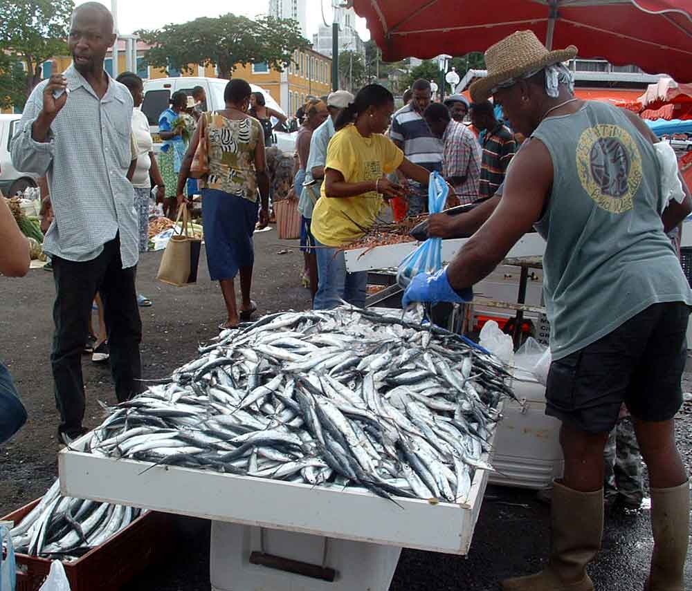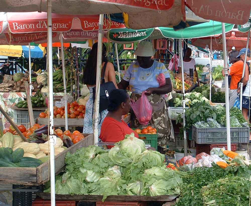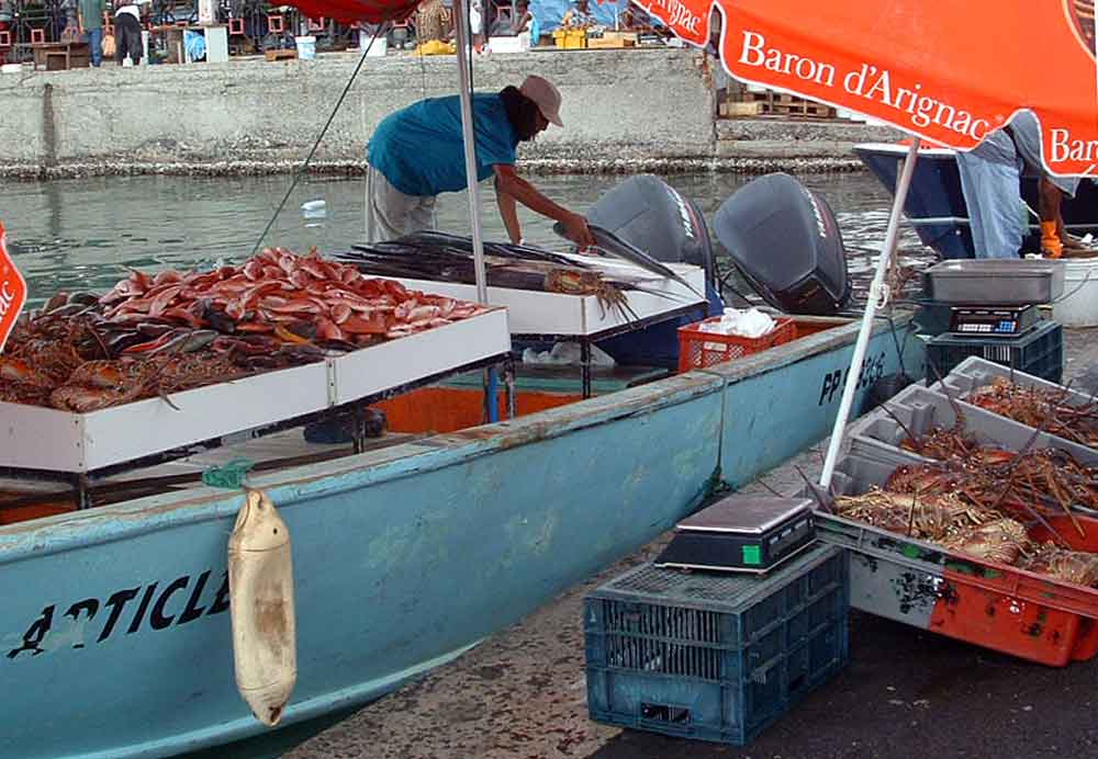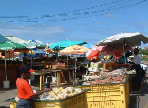 Wrote an essay on Aging and commentary about the US Media Sellout. Made preliminary contact with Herb Hilgenberg by email. Herb, a widely admired and respected amateur, does weather routing from his home in Canada for vessels crossing the Atlantic. Spent a delay day brushing up on radar skills, working out collision avoidance problems on the Starpath Radar Trainer and using the laminated Maneuvering Board--and re-reading the manual for our Raytheon Pathfinder L-70 system. Made checklists for radar work and collision avoidance and added them to the Boat Cards. Dare we say it--haven't had any archy (roach) sightings since Rorie left. Did he take them with him? Did we kill them all? Are the cookies that effective? Retreived camera from doghouse. Took bus to the market in Pointe a Pitre, stocked up on veggies, drooled at the langouste (lobsters), but bought some fish instead.