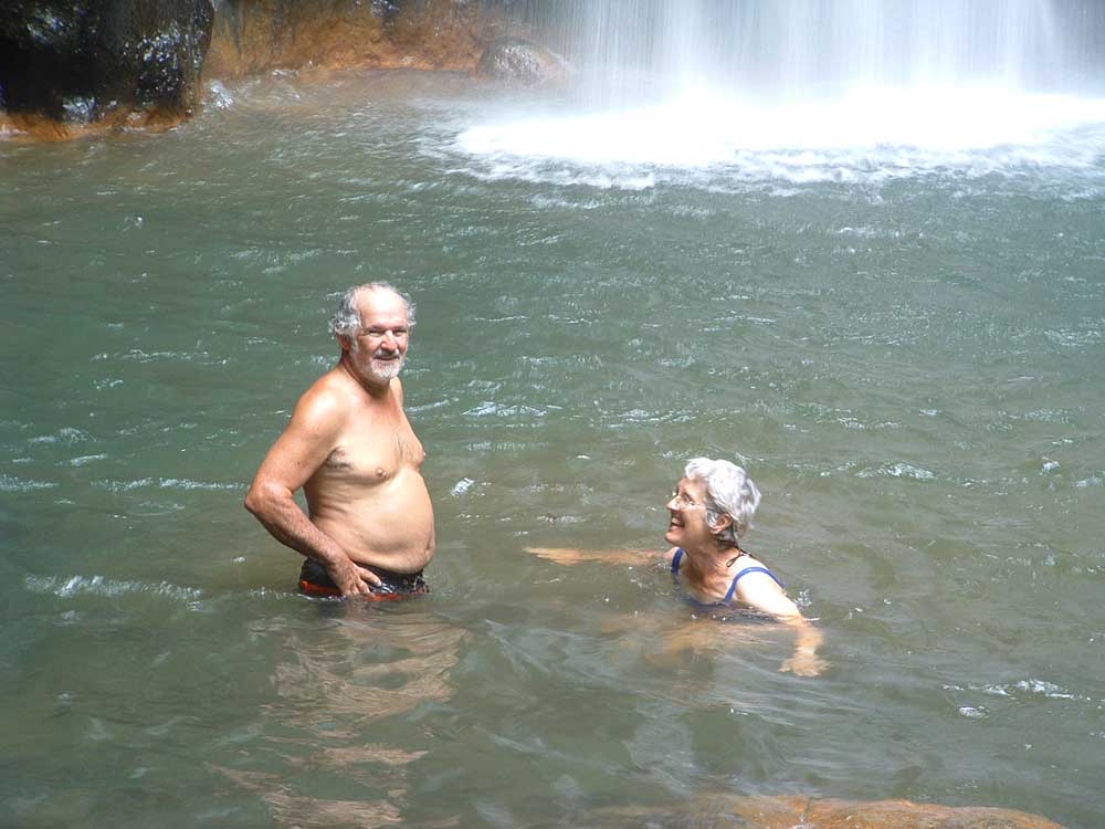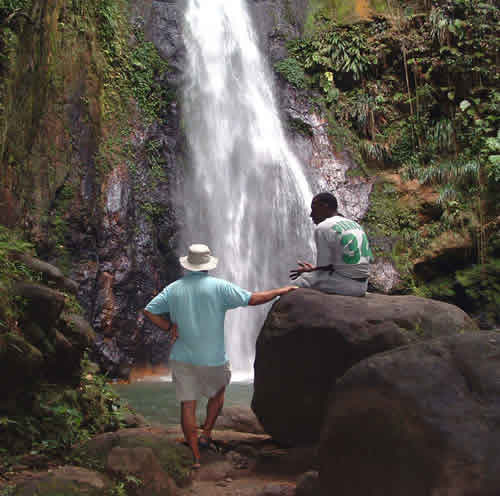 Week flew by. Much sightseeing, with assist of rental car. Rorie gets seasick easily and is not (?yet) into sailing, so for his first visit and to ease him in, we made no trips on Callipygia. Took sight-seeing boat from Malendure beach to Pigeon Island to snorkel--great spot. Found way to Cascade Acomat and followed trail to bottom of this lovely waterfall--no-one else anywhere near this sweet dipping spot. Got stuck in traffic jam on road into Pointe Noire--carnival festivities. Spent time on Plage de la Perle, north of Deshaies. Hiked to summit of Soufriere, Guadeloupe's active volcano. Swirling mists added to the eerie and scary experience of being enveloped by voluminous clouds of steam escaping from the vents. Almost got blown over by high winds at the summit. Hiked to the cascades at Le Carbet--330' waterfall, droppng down a cliff face into a river pool. Some hot ponds nearby fed by volcanic hot springs--great for the tired feet. A quick visit to isolated Grand Etang lake--spectacularly beautiful and secluded, only sounds were those made by birds, frogs, and insects. Ferry to Isle Marie Galante, and visited gorgeous beaches, especially Capesterre, swells pounding on its protective reefs. Got approval to use Guadeloupe surveyor Martial Barriel (phone: 0 590 281 441). On Tuesday, he did an in-depth in-water survey of the boat, and furnished his report (three very minor items to attend to) which we forwarded to the insurance agent. Glad to get independent opinion of Callipygia's seaworthiness, condition, and value--darned right, after all the work and $$ we have put into her. Spent a day doing chores (mail, taxes, and assorted boat items). Watched tall ship Salomon, homeport Gibralter, come in to refuel at the marina. Ship provides 9-month sailing program for 15 "maladjusted" German youth who have been involved in gang activity. Impressive to watch them muster, then go to their posts --climbing the ratlines on the all-rope rigging and clambering out to loosen the square sails. Ate lobster and baked delights from the patisserie to celebrate a 65th birthday. Killed a couple of cockroaches, researched their boat habits, laid out more boric acid cookies. They won't like Ireland's cold winter (if there are any left by then), and if they survive that we'll have to get a cat. A typewriter too, maybe. Took a leisurely day of exploration along Grand Terre's south and southeast coasts, enjoying the view from Fort Fleur d'Epee, and the water/beaches at Sainte Anne and Saint Francois--where we ate a delicious and cheap Indian lunch. Gawked again at crashing breakers on Point des Chateaux, and found some terrific snorkeling inside the reef at Grande Saline just north of the point. Stopped at lovely secluded Pointe de l'Enfer on the way to Le Moule, where we got hand-cranked coconut ice cream from a street vendor. Yesterday morning, took the bus into Pointe a Pitre to the busy Saturday markets, and to shop at Electro Nautic, the huge chandlery. Delivered Rorie back to the airport, and said goodbye. A terrific visit--vacation for us too (and from the camera!).