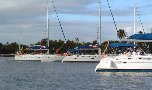 So far this week, much work and mostly successes. Resolved the issue with our new 12-volt laptop charger (Targus)--faulty connection. Then made shore power connection for our new 110/230 volt battery charger, installed in Trinidad. Plugged into 220 volts on the dock--hey presto, it works! Charges the batteries and 'frig beautifully. This marina requires liability insurance, so spent much time shopping for that--we no longer carry hull insurance since Lloyds quit covering yachts in the Caribbean year round. We knew we'd have to get liability coverage at some point for our time in the UK. Cleaned the rust spots off the windvane. Cleaned the topsides. Set up the fresh water hose to the dock, filled the water tanks and jerry jugs. Jugged 11 gallons of diesel into the tank. Emptied out the sail locker and another locker under the V-berth. Took the genoa and the storm jib ashore onto the grass behind fuel dock. Laid them out, inspected and flaked/folded them. Much reduced storage requirements! Put the storm trysail on the mast track, checked everything, adjusted its sheets and figured out where they would lead--to the aft block on the jib traveller, then to the jibsheet winch. Took the trysail ashore, and flaked it ready for easy hoisting. Reduced its stowage requirements too. Inventoried everything in the sail and forward v-berth lockers. Developed stowage plan for crossing the pond. Got laundry done. Emptied out and inventoried the emergency locker, checked dates on all flares and ditch bag supplies and made sure everything is working. Got to know Robert and Dorian next door, shared know how on assorted boat matters. Shopped the car-rental places and made reservations at Cap Caraibes. Finished essay on the Cruising Life. Repaired a chip in the topside paint/gelcoat near the bow. Took bus to Pointe a Pitre and got our bearings, fantastic chandlery (Electro Nautic), great markets, location of ferry dock. Small boater directly across the dock (and downwind) from us almost asphyxiated us by running his poorly tuned outboard at high revs interminably. On explaining our difficulty, he simply laughed. We have found a noticeable number of the French people here rude and inconsiderate. We're loving this marina, the most sheltered we've been in and with the most convenient and numerous services, shops, restaurants, etc. It's hard to think of anything we'd need we couldn't find here. The index finger of both hands of one of us continues to have painful joints, swollen on the right hand (too much pointing?) and the other one of us has a cold.