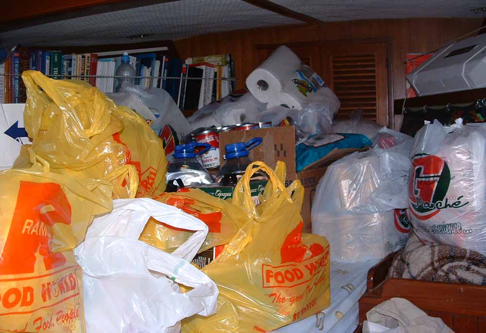 Still here and waiting.... Our delay week passed thusly: Began grappling with provision planning for Atlantic crossing. Decided to leave St. Martin with provisions sufficient for at least 5-6 weeks, using the following provision planning scheme: (1) developed menu options for each meal (breakfast, lunch, dinner, snack) based on food groups; (2) from that, made master food list; (3) made storage plan; (4) went through food we have on board, inventoried it, and tossed out-of-date items (not toooo much); and (5) adjusted master list based on storage space; (6) on master list, marked off food already on board thereby producing the shopping list. All of this gustatory activity sparked our collective cooking interests--which had been decidedly in the tank recently. Indeed we must confess to serving more than a few lousy meals of late. To help the one of us who is not a natural cook, the other wrote up a bunch of easy-to-make yet tasty recipes on file cards, and posted them in the galley.