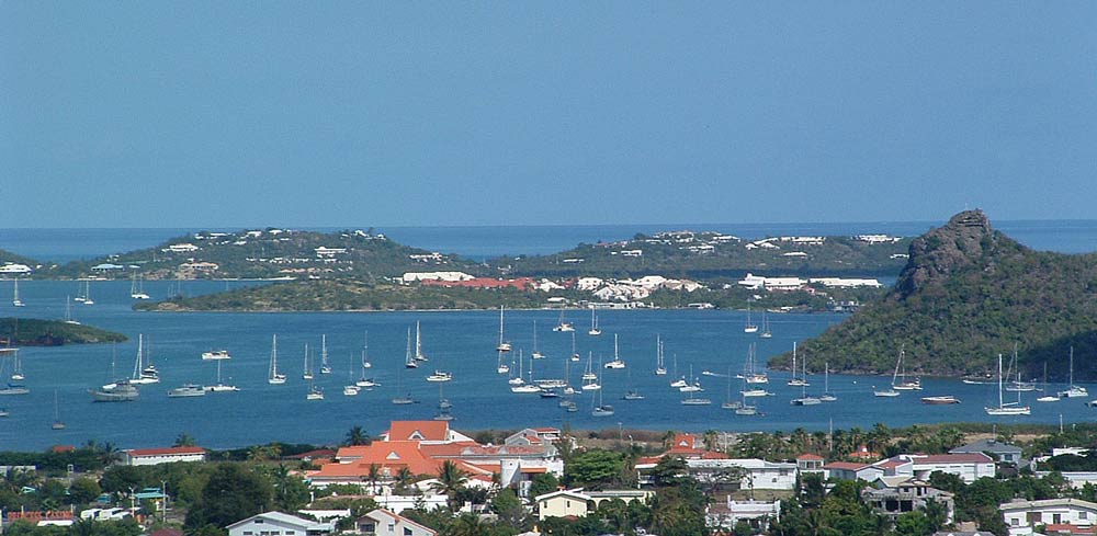 Friday, spent the morning to-ing and fro-ing the laundromat, 4 loads washed and dried, 3 hours of effort. Learning to carry bundle on head. Hooked up power to 110 volts. Our new bi-voltage charger is working great. The boat's hot water tank likes 100 volts, so we'll have that little luxury here. Put up the awning over the main cabin to reduce the heat. In the afternoon, rode the dinghy over to La Palapa Marina, and explored Simpson Bay on the other side of the bridge. Ended up at the Sint Maartin Yacht Club, in its new building by the bridge. Spectacular spot. Enjoyed happy hour and some cheap eats. Maybe we'll join (it has very reasonable fees), then we'll have the requisite "Yacht Club" affiliation for hobnobbing in the UK. From the Yacht Club, had fun watching the long Friday afternoon parade of megayachts (plus some regular boats) entering the lagoon at the 1730 hours bridge opening. A fairly breathtaking experience. Talk about some lavishly conspicuous opulence. As we prepare for our ocean crossing, added the Four Rules of Preparation to the website. Learned that in Tuesday's elections, Antiguans turned out the corrupt old-order ALP and swept in the UPP's new broom. Saturday, took long (4-mile) dinghy ride to the other end of the lagoon, to explore Marigot, the capital of the French side of this divided island. Pretty little touristy town. Walked around the breakwater, giving scant protection to Marigot Bay and the sailboats anchored there. Quite exposed in northeast winds and northerly swells. Rode home past all the megayachts at Isle De Sol marina. Scary evening moment after turning on hot water heater before doing dishes. After a bit, smelled some smoke--open door under galley sink, small flame near the plumbing. Turned off hot water heater, and flame went out. No immediate explanation, but left everything electrical off 'til tomorrow for further investigation. This one wasn't on the todo list, but better show up now than later--or worse, when we're off the boat or asleep.