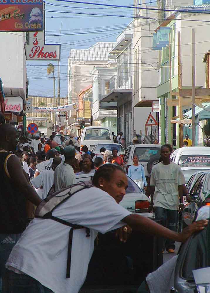 Recovered quickly from mooring snafu. Cuts and bruises healing fast. Thursday, got up early and enjoyed new view from the cockpit with morning coffee. Put sails away under their covers, inflated and launched the dinghy and put outboard motor on. Went ashore to explore Jolly Harbour. Pretty upscale place, gated and resort-like. Marina is at head of lagoon with several hundred residential units ranging from town-house type to palatial, each with it's own dock. Not exactly "us". Many shops and several restaurants. Nice (hot!) showers. Restaurants tended to the pricy except for Phil's, a little local eating place next to the customs office. Went to the Internet cafe, $24EC for a half hour ($8.88US). Ouch. Think longingly of Guadeloupe, and Marina Bas Du Fort. Walked out to the main road by the gate into the Jolly Harbour complex. Took bus ($1US) to St. John, nice to be back somewhere we've been before and can (still) remember. Found ATM. Found supermarket--yippee, it had Bisquick and Pancake Mix. And Lime Squash. Found BioHealth Medical Lab at corner of Market and Nevis Streets, and gave blood for PSA test. $85EC=$32US. Good place. Went to cruise ship docks and ascertained from harbourmaster at which one Brilliance Of The Sea will arrive on Saturday. Read local newspaper, the (opposition leaning) Daily Observer, full of election news--voting day is March 23rd. Hotly contested race between two major parties, the ALP and the UPP. The ALP has been in power since independence (1981) despite major charges and findings of corruption. Nice to be back in a place where our native language is spoken/written. Relaxed in cockpit while watching beautiful sunset over hills, egrets flying home from work, and pelicans catching supper. Friday, finished cleaning up the boat and went ashore to walk around the Jolly Harbour complex. Ate big, excellent and cheap (local food) lunch at Phil's: rice 'n peas, macaroni pie, potato salad, curried lamb (bones), and steamed mixed veggies. Arranged for clearance and delivery of our shipment from Marine Warehouse. Did some more provisioning at the marina supermarket--very well stocked and not overly pricy.
