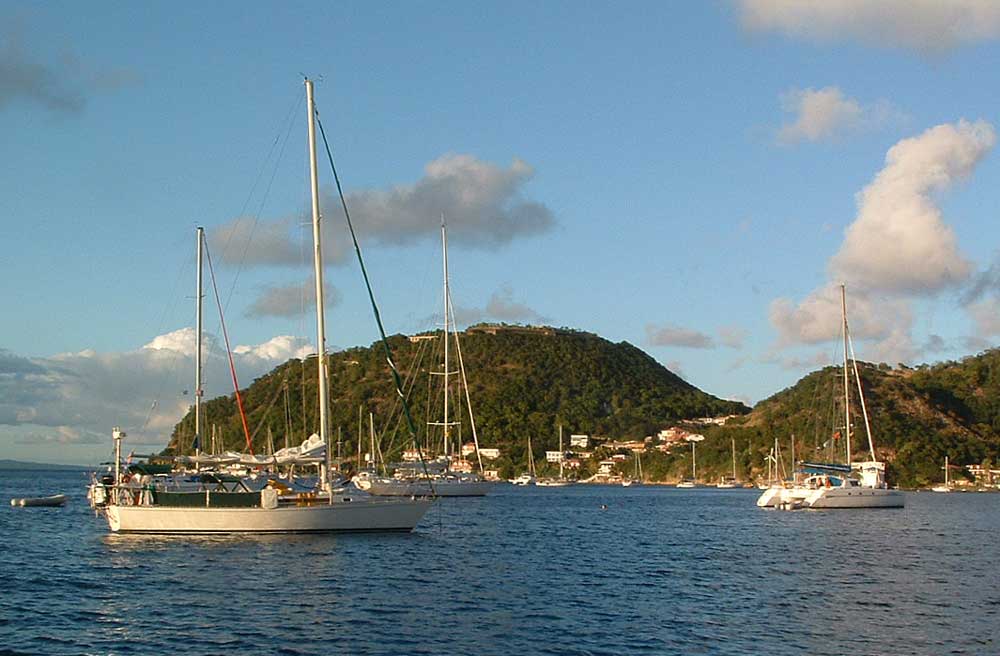 This morning, upped anchor at 0750 hrs and motored out into the bay, where we raised the main and staysail. Motorsailed up the north end of Dominica in light wind, unfurling the yankee. turned off the engine after batteries/'frig charged. Found 14-16 knots across the inter-island passage, pleasant close reach, doing 6.5 - 7 knots, towing the dinghy. Passed two cruiseship schooners under full sail, one 5 masts and one with 4. Too lumpy for a good photo. Another sailboat going ahead of us. As we approached the 8-island group of Les Saintes, hard to make out which is which. Sailboat ahead took rhumb-line opening, and it took some thought to figure out what it was doing--a nice straight line through a very tight cut between two reefy islands--not the recommended route. Thank goodness for the GPS, makes navigation much easier. Decided to stay south of the first three barrier islands, and not try to go between them. Rolled in the yankee, and dropped the staysail, turned on the motor. Headed west to find wide Passe du Sud Ouest and headed northeast to pass between Terre den Bas and first Les Augustines, then Terre Den Haut. Eyeballed the various anchorages, picked a spot off the fishing harbor at the main village, and dropped the hook at 1200 hours in 30 feet. 21.1 nmiles, average boat speed 5.5 knots. Put the motor and other equipment back into the dinghy, and motored to the ferry dock and tied up. Walked around the waterfront and got orientation to this very French very touristy place. Ate excellent (not cheap) lunch at La Genoise, and found out that one can now clear in here, at the Police station. Found it, did paperwork, and spent an hour or so checking out the town, inundated with two ferryloads of tourists from Guadeloupe. A lovely anchorage, but we've seen enough of this pretty but plastic little town.