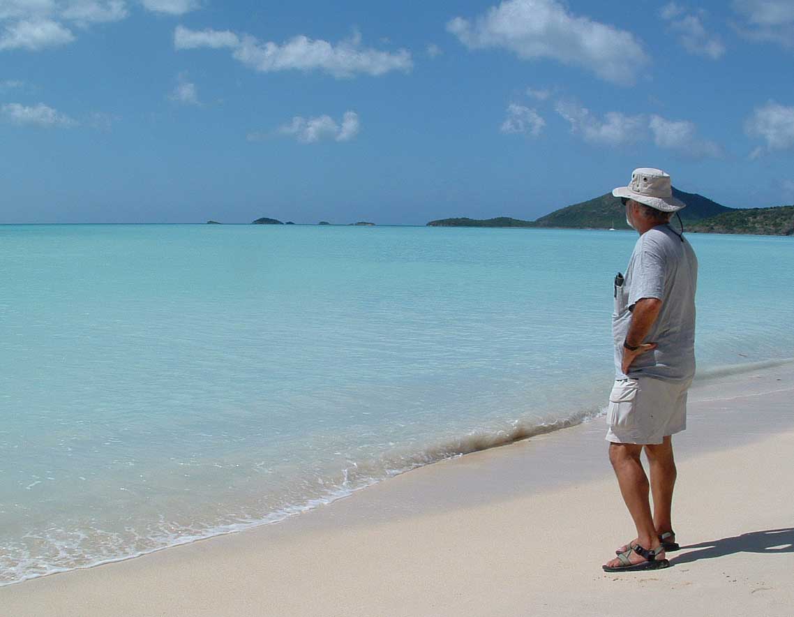 Saturday, up early and took bus into St. John. Watched enormous Brilliance of the Sea arrive and dock. 2,500 passengers, 800 crew. Connected with friends Margaret and Bill from Perth, Scotland. Great reunion. Wandered through the busy Saturday market, then took the bus to English Harbour. Explored Nelson's Boatyard, and walked out to the point overlooking Freeman Bay, where we anchored for a week or two last year on our way south. Saw Samen safely at anchor there. Back to Jolly Harbour, and dinghied out to Callipygia for lunch and talking time. Then walked over to the beach, past a mangrove lagoon filled with water-birds, including a Little Blue Heron. Lovely pulverised shell beach edged with milky turquoise surf. Went for a quick dip before taking the bus back to St. John. Made our way through the throng in Market Street to the cruiseship dock to say goodbyes. Weather forecast has swells up around 10' for the week, winds out of the northeast at 20-25 knots. Looks like we'll be here a bit longer. We'll work on ocean crossing preparations.