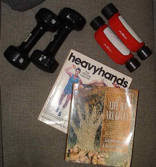 Not surprisingly, once we moved aboard Callipygia we both slowly gained weight. We found that in the cruising life it was very hard to get enough exercise. Bill's blood pressure began to creep up. We didn't like how tired we got on long passages. It was hard to do the exercises and stretches in the ITP Kata, although intermittently we did try. We remembered how much better we felt back in the "old days" when we regularly exercised. Then one day we noticed that among the stuff we had moved onto the boat were some weights and the book Heavy Hands, the Ultimate Workout by Leonard Schwartz. Knowing that we'd only stick with a routine if it was both convenient and enjoyable, we felt we had to find a way where our "workouts" were not work but pleasure. The strength-building routine listed below often worked for us on the boat. We also found we could get some aerobic exercise swinging hand weights while walking. When we stuck to exercising, we were happy with how much better we felt, how much trimmer we looked, and the increased energy levels that we enjoyed.