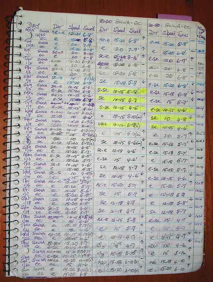 Even when we were in harbor for an extended period, we kept track of the daily weather observations, and the NWS Offshore Report (which we get every morning along with our e-mail from Winlink) and filled out both tables at the back of the notebook. We also usually listened to at least one Net each day so we could hear about unusual happenings and see what was heading our way. [We got caught off guard one night in the Bahamas when a storm came up in the night - we nearly lost our dinghy and some others in Marsh Harbour lost their boat.]