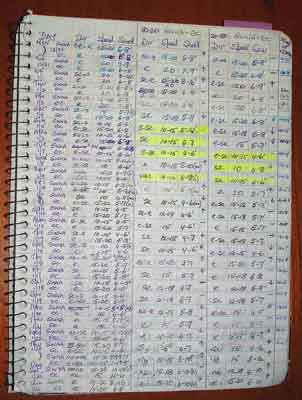 The notes in the body of the pages were formatted as follows: next to the day and date, we listed the weather source (Net name or broadcaster) which was underlined so it was easy to see. Following the name, on the same line, was the SSB channel and frequency, and the quality of the transmission (Readability on a scale of 1-5, with 5 being excellent, and Strength on the same scale.) Underneath this heading the notes were made. If listening to a NWS voice report, shorthand was used as described above. If a weather fax was received, a note of the time and title of the weatherfax chart(s) was recorded. If a text or Navtext forecast was received and stored on the computer, that was also noted. At the end of the last set of notes for the day, a line was drawn across the page.