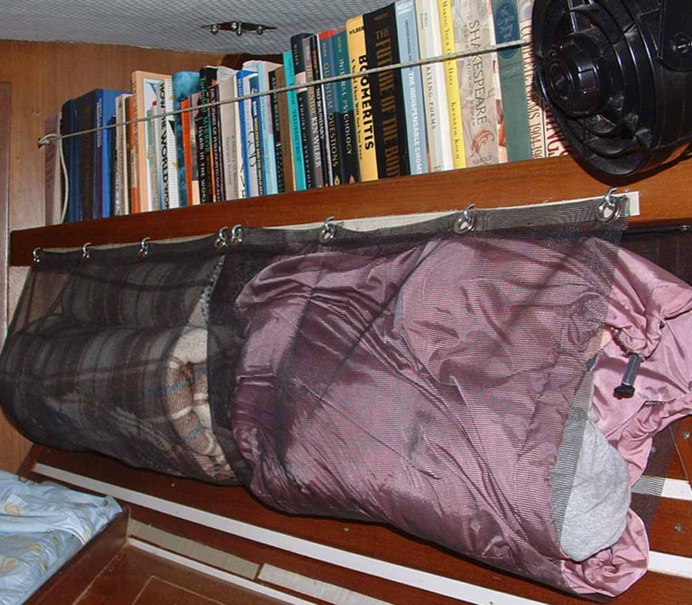 - Netting Lockers: We had shelves running the full length of the sides of the V-berth and on one side of the quarter berth. In the V-berth, the shelves were full of books. There was empty space under these shelves where the sides of the boat sloped in towards the beds. So we made "netting lockers" to hold light-weight items like blankets, linens, dirty laundry, etc.. To make the "lockers", we bought heavy-duty, fine-meshed, black nylon netting (screen quality). We cut it into pieces 18" wide by 36" long. We used 4 pieces on one side of the V-berth, 2 on the other side, and 2 on the quarter-berth (that's how long the shelves are). On one (narrow) end of each netting piece, we made a 1+ inch hem and put in 3 grommets. The other end we made a triple hem, 1/3" wide. The triple-hem end we attached to the bottom of the bookshelves next to the hull with a row of screws with washers. On the bottom of the open edge of the bookshelves, we screwed hooks to hang the grommets on. Worked great. [We tried it first using velcro and glue, but after a while it all turned into a sticky mess and we started over.]