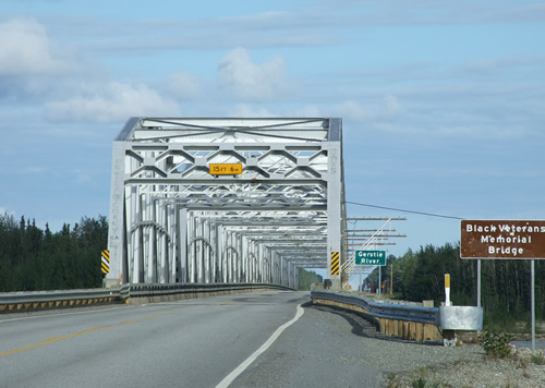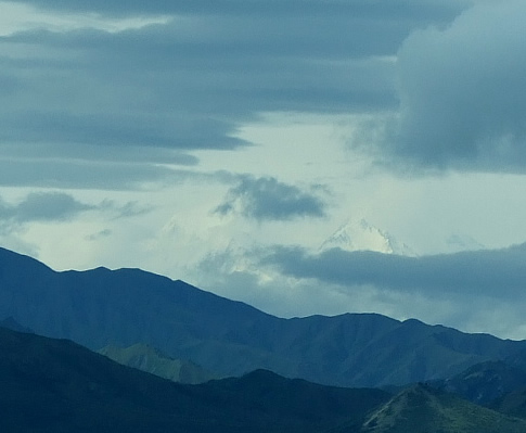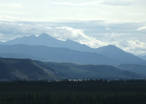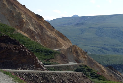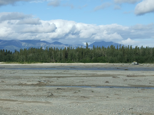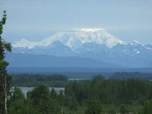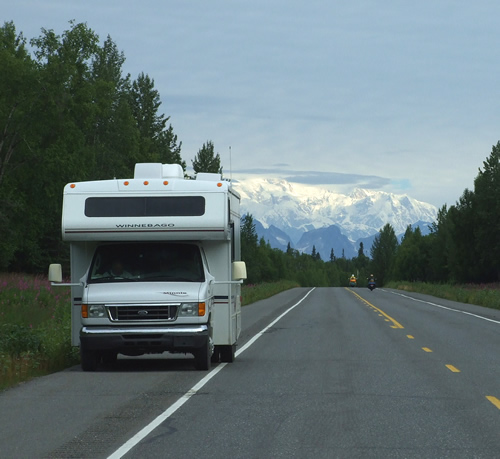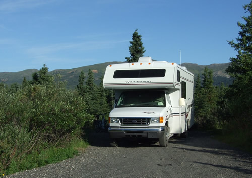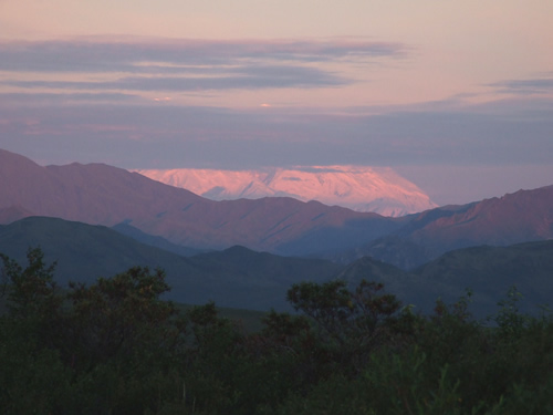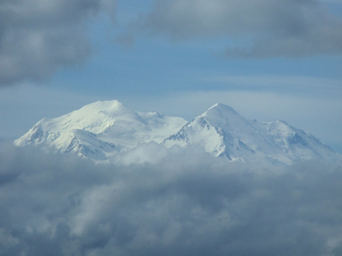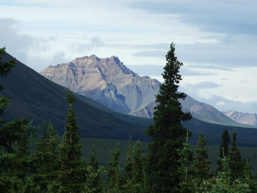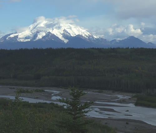 Slept soundly in the noisy Canyon village and woke to a cloudy breezy 51°. After a quick breakfast we dumped the holding tanks and drove the mile to the Park entrance. The Park road goes 89 miles into the National Park, ending at the former mining village of Kantishna. The first 15 miles to Savage River are paved and open to the public. The rest of the road is dirt/gravel and closed to traffic except park buses and permitted vehicles. Our permit for Teklanika allowed us to travel another 15 miles beyond the Savage River checkpoint to this campground. A 3-day minimum stay is required as part of the effort to reduce traffic on the Park Road. We heard that the first views of "the mountain" arrive at mile 9 of the Park Road. Oh my, are we confused. Of all those mountains ahead of us, which one is it? Hard to tell. Found a viewpoint identifying the peaks, the one we were looking at is Double Mountain. Can't see Denali. In the local lingo, "the mountain is not out today." Stopped at the Savage River checkpoint, had our permit inspected, and were pleasantly surprised to find the road well graded and smooth even though no longer paved. Stopped at mile 17.3 to look at the Alaska Range. Lo, a glimmer of Denali unfolds before us in the clouds. There's no longer any doubt about which it is. We continued on to this pleasant campground, picked our spot, and settled in. 33 miles. No hook ups, but we're perfectly self-sufficient; fresh water tank is full, gas tank is full for the generator, inverter powers the laptops, and propane supplies the 'frig, heat, and stove. Made lunch, biked around the campground, trekked out onto the gravel of the Teklanika River bed - no grizzlies in sight. Nice place to be 'at home.' After dinner, finished up at the evening's ranger program, very entertaining; first, using the assembled kids (8), demonstrated what do to in a wild animal encounter; and then a hilarious history of how the mountain was first climbed and assorted claims about who reached the top first. We're calling the mountain Denali, which is its official Alaska name. "Denali" is what the Athabascan's called it, meaning "the high one." The mountain acquired the name Mt. McKinley in 1896 from an Ohio gold prospector, a fan of William McKinley who otherwise has no connection to Alaska. That name still sticks in the U.S. Geological Survey.