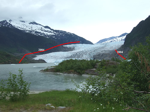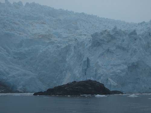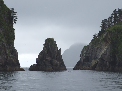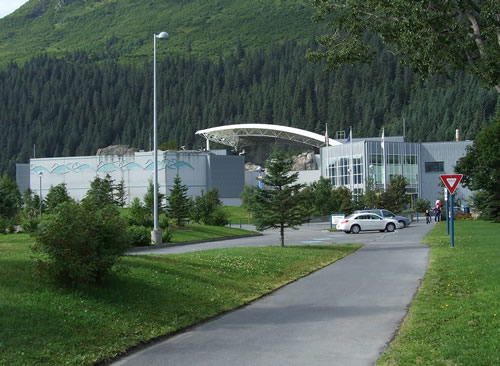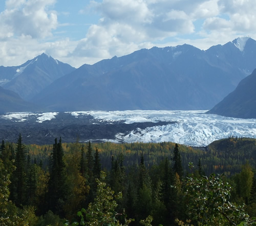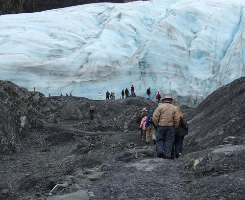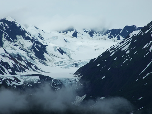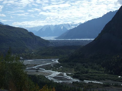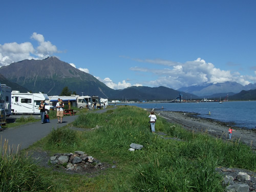 Enjoyed our stay in Kenai, but it's kind of a "no there there" place. Drizzle hampered our enjoyment of beach walks. We left a week ago Sunday morning. Drizzle on and off as we drove back to Soldotna to join the Sterling Highway going towards Anchorage. After Cooper Landing we turned onto the Seward Highway to its end at this interesting and isolated town, the gateway to the Kenai Fjords National Park. Arrived around noon, the huge waterfront campground was hopping. About 400 campsites, 100 of which have hookups-and many of these get reserved for caravans. Thankfully, the season is winding down and we snagged a hookup campsite near the restrooms with a view of snow-capped mountains across Resurrection Bay. Since this is our home and we're not on vacation, mod cons are important to our comfort. We don't mind dry camping for a view days in beautiful places, especially if it's warm and sunny. But... It rained/drizzled for nearly a week, then cleared nicely for the weekend. The campground is in the middle of Seward, sited on the area of the industrial waterfront that was destroyed in the 1964 earthquake. There's a bike path along the waterfront that joins the 2-parts of town: harbour and boats with visitor info, buzz, shops on the north, and the old town and the Alaska SeaLife Center on the south. Nice place, permanent population about 2,000. Among other activities, we walked to the SeaLife Center, educational and informative. Apalled, though, to find it's climate change exhibit giving credence to the supposed anti-science controversy peddled by the Bush administration et al. Pat went on an all-day wildlife boat tour in the rain, a long day in a small overcrowded boat but some good wildlife sightings in the Chiswell Islands and a view of the crumbling face of the Aialik Glacier. Bill had a massage instead. Our rain gear got quite a work out that week. Friday, dry, so we drove Clemmie a dozen miles to the Exit Glacier ranger station and hiked up to look at this fast disappearing finger of the Harding Icefield. We visited the lovely little Seward museum. We worked on our projects, and took many walks. You can see all our Seward photos in the Photo Album. High's have been consistently near 60° and lows near 50°. Daylight is now reduced by 2 hours from Anchorage, to 14+ hours.