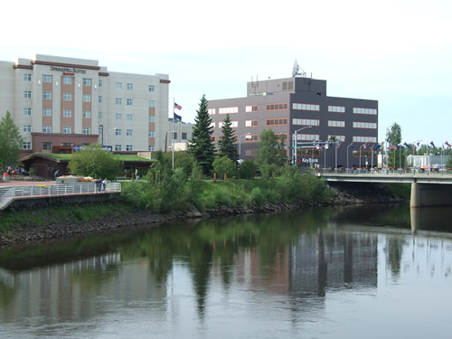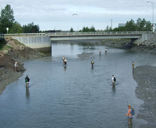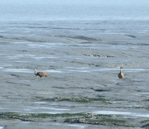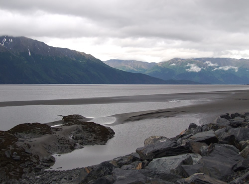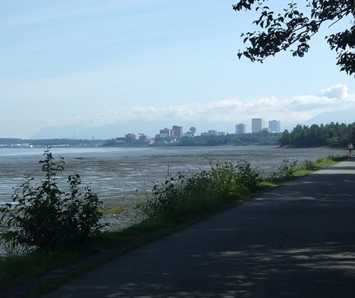 The mountain (Denali) was not "out" as we left Talkeetna yesterday morning, generally overcast and hazy as we continued south towards Anchorage. Parked Clemmie on the north side of downtown Anchorage for an hour or two and wandered round. Bought ourselves an ulu at the Ulu Factory (easy, fast chop and slice, you should have one.) Collected the usual mounds of info at the Visitor Center (old log cabin) and the Alaska Public Lands information center. Cruised the Anchorage Market, no veggies, many crafts and knick-knacks, and food stands. Ate piroshkis, then wished we hadn't. Next we came to this small and tight RV Park, chosen for its location beside the Chester Creek bike trail. Today, the weather belies the forecast. Gorgeous. Biked our little tushes off on Anchorage's fabulous bike trails. Pedalled Chester Creek trail past the lagoon to the waterfront, then north to the end of the Coastal Trail. From the Ship Creek bridge watched salmon run the gauntlet of a slew of hopeful fisherman. Then south on the Coastal Trail past the airport. Stopped at Earthquake Park, very educational [read about it on the Slide Show.] Saw a pair of Sandhill Cranes feeding on the mudflats. Added to our overflowing store of photos, this hobby is completely out of control. Tomorrow, Clemmie goes for an oil change and checkup. Bill flies east on Wednesday for Ashley's wedding, while Pat takes Clemmie south to Homer. Pix of our Alaska travels are, of course, still trickling but the slide show is well underway and the Photo Album page of Denali is finished.