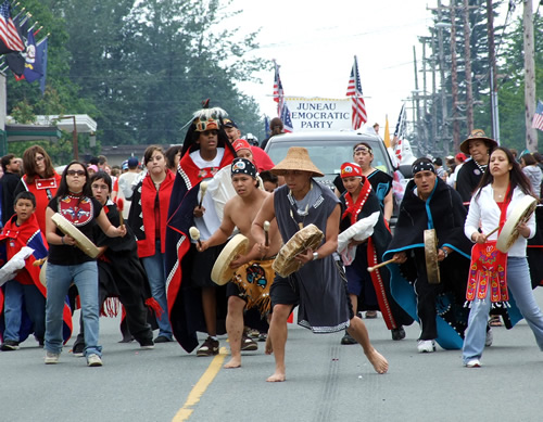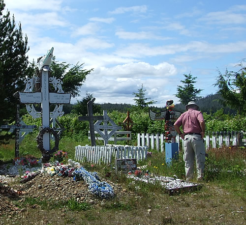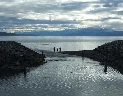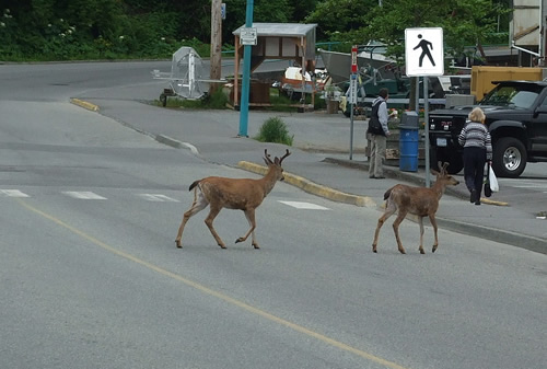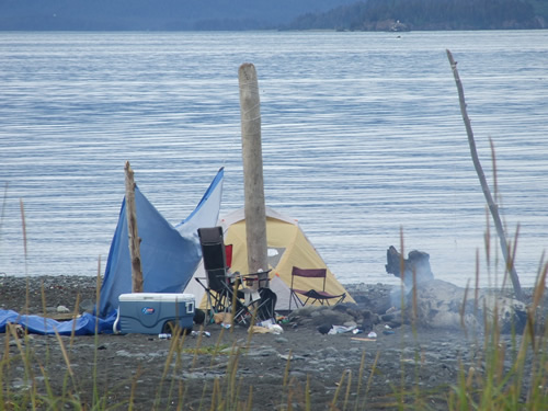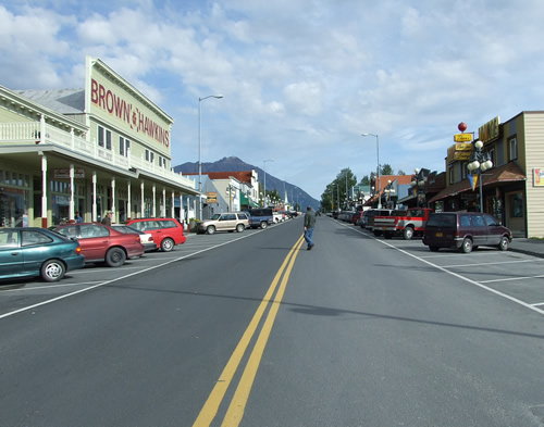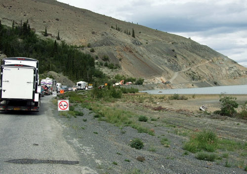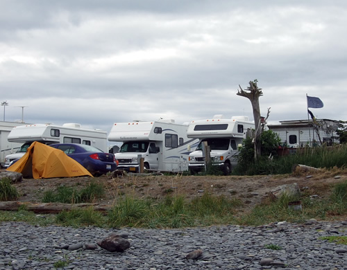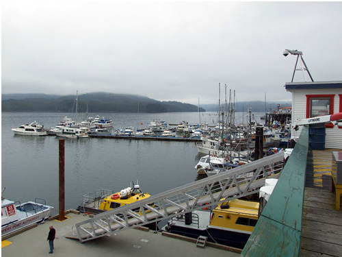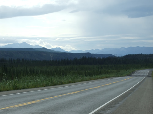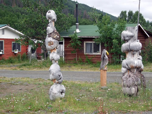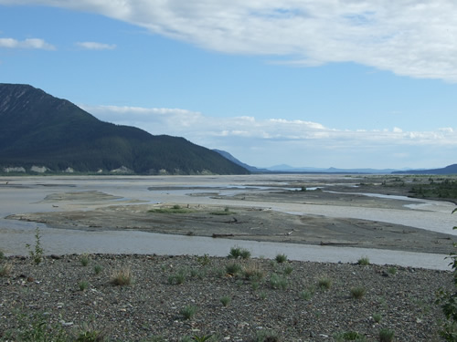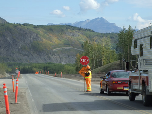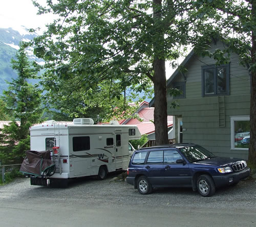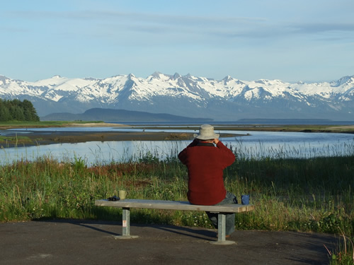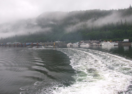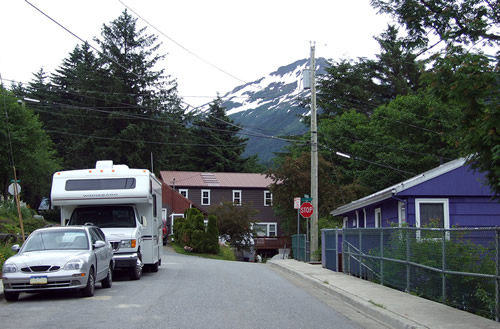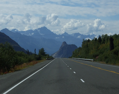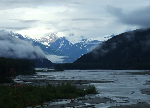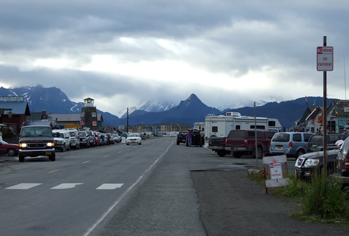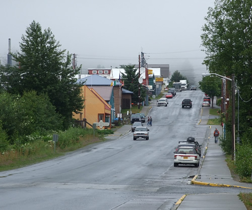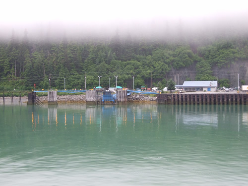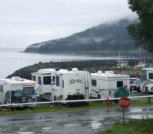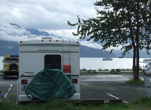 Coffee pot woke us up at 4:00am in Tok this morning and we left by 5:00am. The 100 miles of Alaska Highway to the Canadian border was quiet and not too bumpy. Then, for most of the next 120 miles through the Yukon to Burwash Landing the road was no better than when we came north. This time, though, we were in a hurry. We bumped, bounced and rattled along trusting Clemmie to take the punishment so we could get this over. The road improved along Lake Kluane until the construction work near the Sheep Mountain Visitor Center - not much had changed since we passed by in July. 30+minute delay. Fortunately, once through this, the 14-mile washboard surface on the other side had been paved so there wer no further delays to Haines Junction. Stopped for gas, and headed down the Haines Highway. Cloudy and drizzle, no views. 40 more miles of Yukon territory, one more 30-minute construction delay, 40 miles through BC over the Haines summit to the US border, and 45 miles winding down beside the Chilkat River to Haines. The waterfront RV park was full, so we settled in here just before 3:00pm. 445 miles. Glad we got started early, we had time to walk around a bit and eat an early dinner (we'd had no lunch) at the Bamboo Room. Early to bed after nice hot shower.
