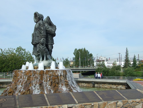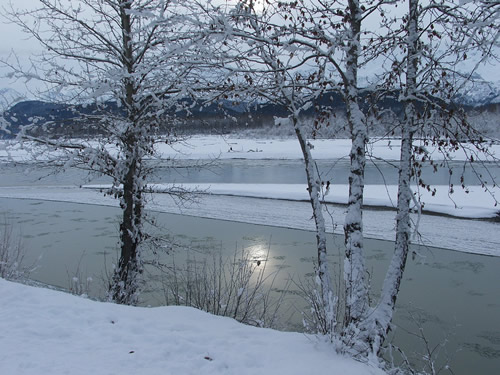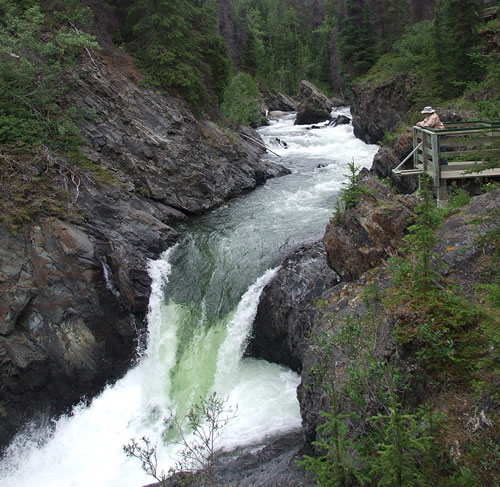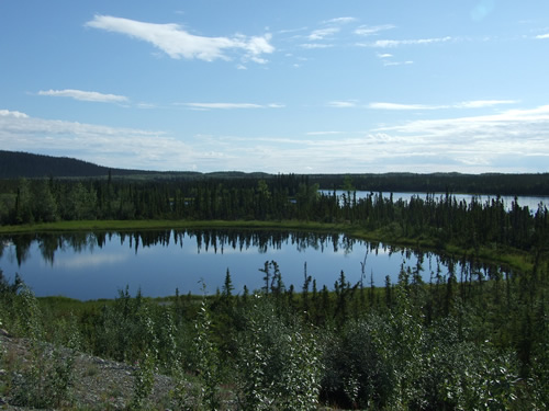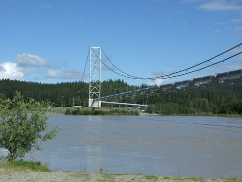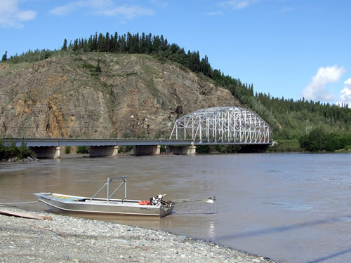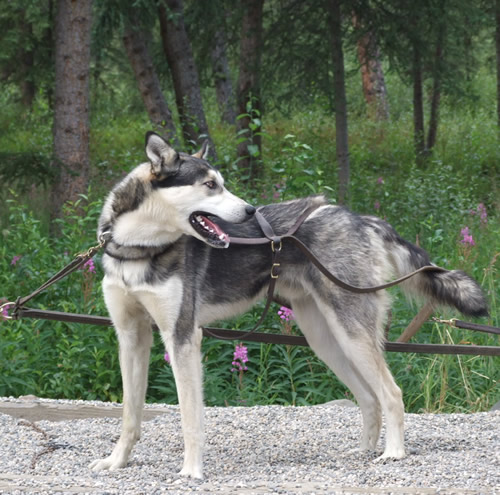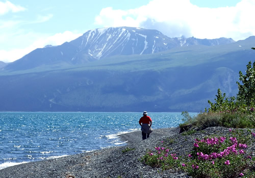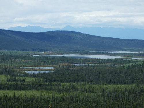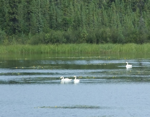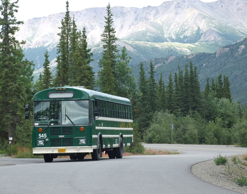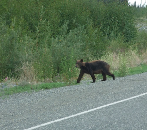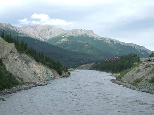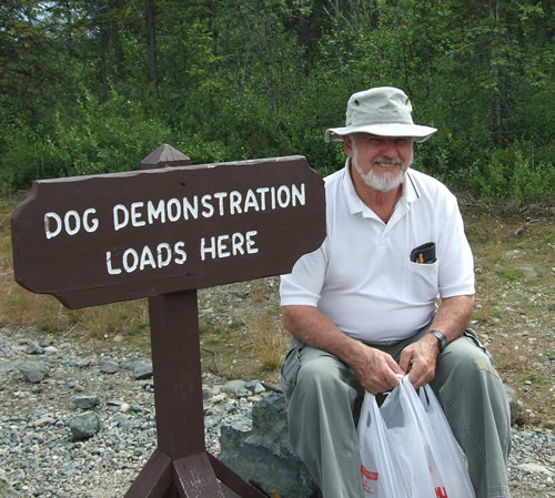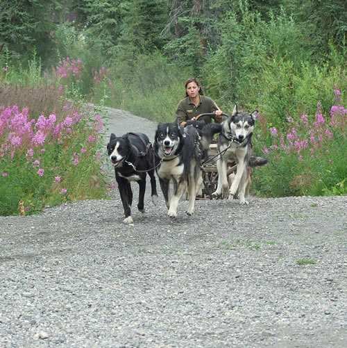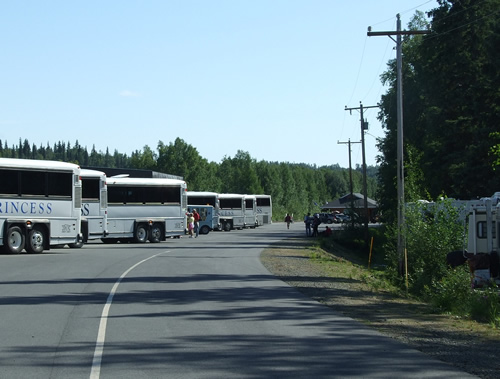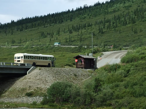 Said goodbye to our float-plane pond view in Fairbanks after coffee and a surprise visit from a Common Loon. Filled the fresh water tank on the way out, drove to a nearby grocery store to stock up on fruit, veggies, coffe and milk. Found our way to Rte 3, the Parks Highway, heading south towards Anchorage. Another lovely day. Pretty scenery but not very photogenic until the Alaska Range came into view. Stopped in Healy to fill the gas and propane tanks. As we approached Denali National Park, the scenery started to take the breath. Stopped at the Nenana River bridge to watch white-water rafters bounce, and a sight-seeing train come through the tunnel. Arrived in "the Canyon", a congolomeration of tourist lodgings and attractions a mile from the entrance to the National Park. Thankful we'd call ahead from Fairbanks to reserve a spot in this convenient RV Park, a gritty parking lot behind a line of log-cabin stores. 121 miles. Plugged Clemmie in just in time to eat lunch. Walked the pleasant trail across the Nenana into the National Park, first to the Wilderness Access Center to pickup our previously reserved bus passes and permit to drive to Teklanika Campground, and then to the Visitor Center. Collected the usual orientation material and took the free bus to watch the Park's sled-dog demonstration. Learned that the sled dogs work in the winter and have several advantages over motorized transportation in the wild. They can travel in the Wilderness portion of the park (no motorized traffic allowed); they don't break down; they don't pollute (or what they do produce makes good compost); they keep you warm in the freezing nights; they sense danger for you; and they don't get lost in white-outs. [We also learned that Alaska has 4 seasons: June, July, August, and winter.] On return to the Visitor Center we took a free shuttle bus the 3 miles back to the Canyon, our feet were weary and the day was late.