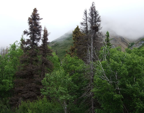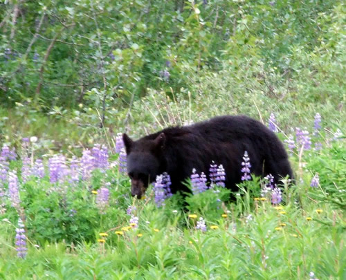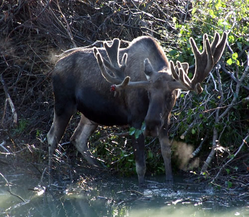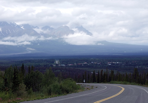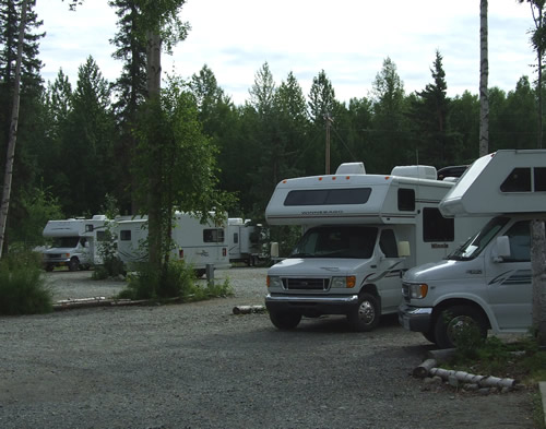 Not exactly where we thought we'd be spending the night when we got up this morning. Arose early, defrosted the freezer and prepared it and the 'frig for a no-propane ferry crossing. Called the ferry system to confirm everything A-OK, then dumped the tanks and drove back north up the Seward Highway to the junction with the road through the railroad tunnel (longest road tunnel in North America) to Whittier. Decided to visit the Alaskan Wildlife Conservation Center, located at the junction. Home to abandoned and injured large mammals and birds. While communing with a young bull moose, the cell phone rang. 'Twas to let us know that our ferry ride was cancelled. No options, this Gulf of Alaska crossing only goes twice a month and there's no other boat to do it. So, we underwent some attitude adjustment. Obviously we have to drive: either 2,500 miles through Alaska, the Yukon, and BC to reach Washington state. Or, 900 miles back to Haines and take the ferry from Haines. Decided on the latter course. Called the ferry system to see if there was any room on boats going to Juneau this weekend. We got lucky, reserved a spot on the Malaspina, leaves Haines Saturday morning and gets us into Juneau only an hour later than the Kennecott would have. So..... Having to get 900 miles under our belt by tomorrow night, we put the pedal to metal and got on with it. Back through Anchorage to Palmer (stop for gas and a few groceries to get us through to Saturday) and then on the scenic Glenn Highway to Glenellen, stopping only for construction, a view of the Malaspina Glacier, and the Matanuska River flowing from the Chugach Mountains, and a look at the iron stained gypsum sides of volcanic Sheep Mountain. Then north for 14 miles on the Richardson Highway, turning onto the Tok cutoff road past the distant St. Elias and Wrangell mountain range to Tok. Thankfully, it was good road surface all the way and light traffic once through Anchorage. 433 miles later we hauled in at this empty campground round 8:00 pm and settled in for the night.