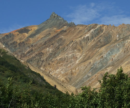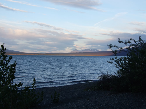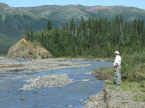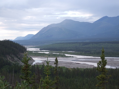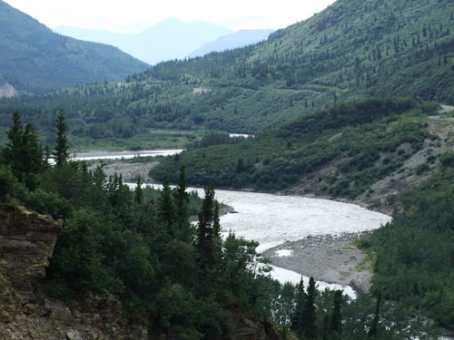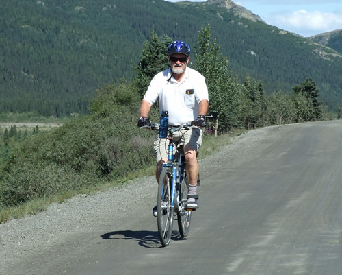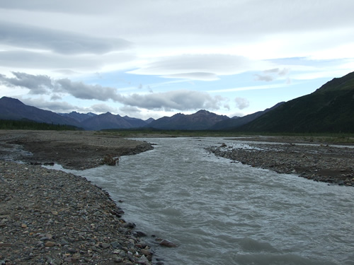 Yesterday we rose early and packed double lunches and backpacks before walking out to the bus stop on the Park Road to wait for our designated bus. The shuttle and tour bus systems are designed to minimize traffic through the park. We had previously reserved seats on the Kantishna bus, which covers the 12-hour round trip 3 times daily. Leaving from this campground cut the trip to "only" 10 hours. A long day, but well worth it. The mountain was out as we drove into the Park, with a ring of clouds round its middle. The road is hair-raising in places spiraling along steep hillsides, bumpy and/or narrow in others. Bus driver (Jeremy) kept the passengers in line, educating them about the Park, the views, and the wildlife. Bus made several stops at designated pits and viewpoints, and impromptu stops for wildlife. Kantishna, the road's end in the middle of the Park, is privately owned. The former gold-rush prospector stakes are now lodges and hotels whose visitors fly in to a small landing strip or ride by designated bus along the Park Road. Evidently Kantishna has only two year-round residents. See our slide show for details and photos from this not-to-be-missed trip. [See Denali page of the Photo Album for more photos.] Today, we hung around the campground and wandered out on the river gravel flats, hoping to see some grizzlies and an American Dipper (on our bird watcher's wish list.) No luck, so we worked up a 40-minute sweat on our bikes to round out our exercise quota for the day.