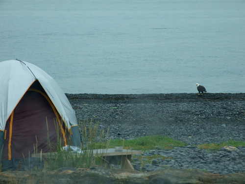 The good weather hung around until Bill arrived off the Homer Stageline shuttle van on Friday afternoon. A long trip for him, with flight from Portland, ME, via Chicago to Anchorage, overnight there, then a 9+ hour van ride to come home to Pat and Clemmie on Homer Spit. Saturday morning we woke to a thick sea fog that remained all day, blowing and swirling ghoulishly round the tents on the beach, and chilling the old bones on our walk. Thankfully it gave way to drizzle overnight and then a few more gorgeous days. We're close to downtown Homer, near Beluga Slough and have a great view over Bishop's Bay. Four Sandhill Cranes fly past us each morning, and return to the Slough for the night. What a treat. This place is toooooooo photogenic, we're drowning in px. They're on the Alaska page of the Photo Album, and the slide show is slowly coming along.
